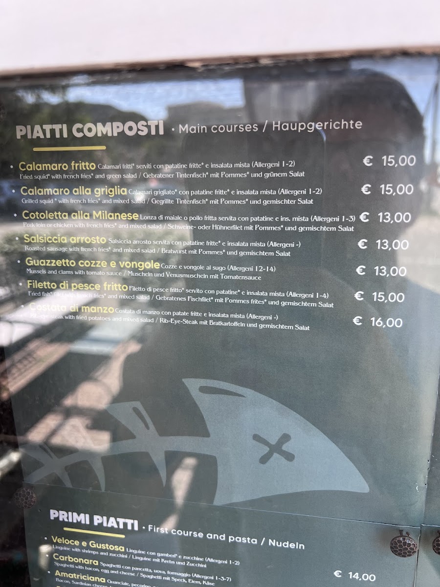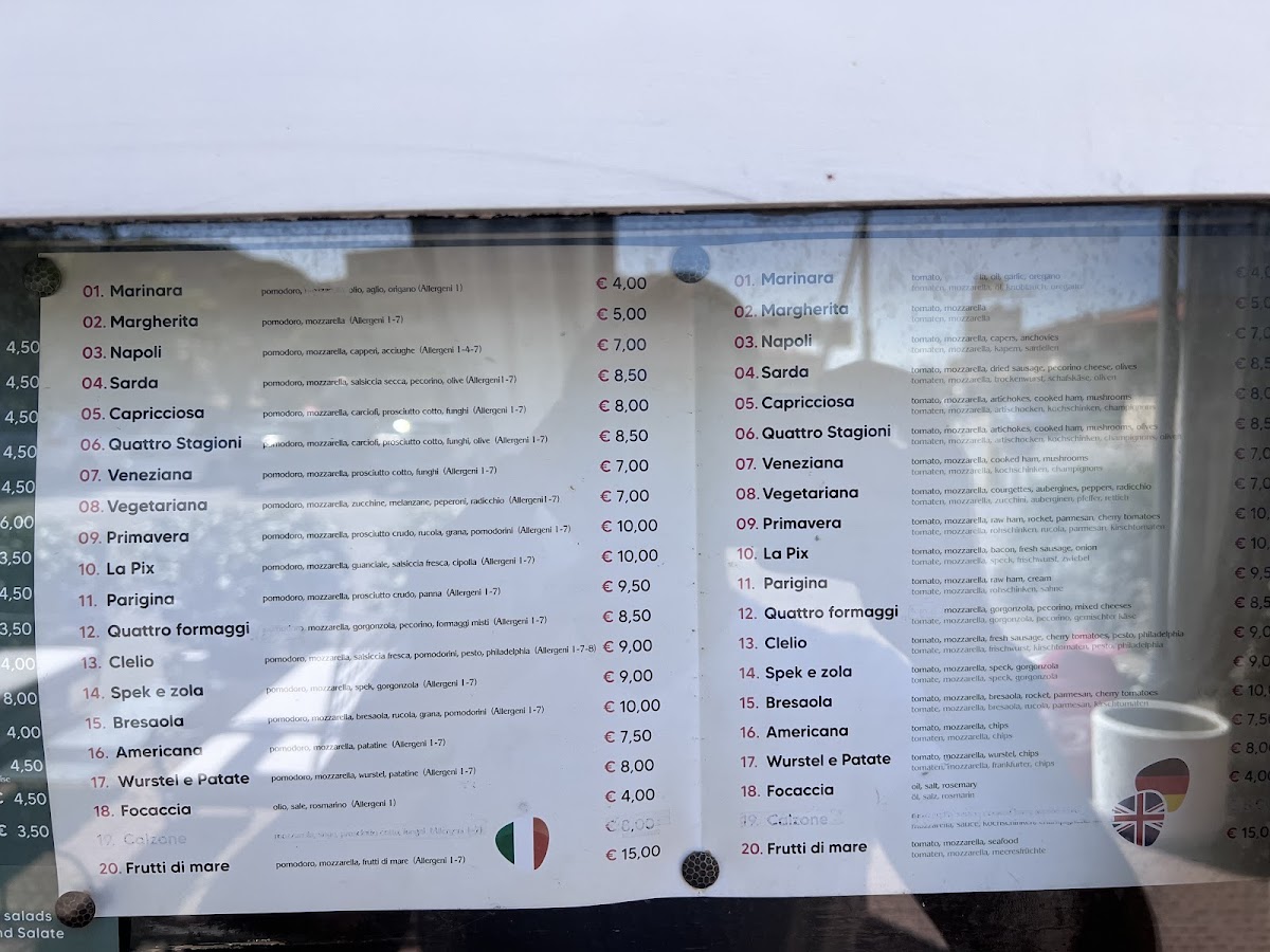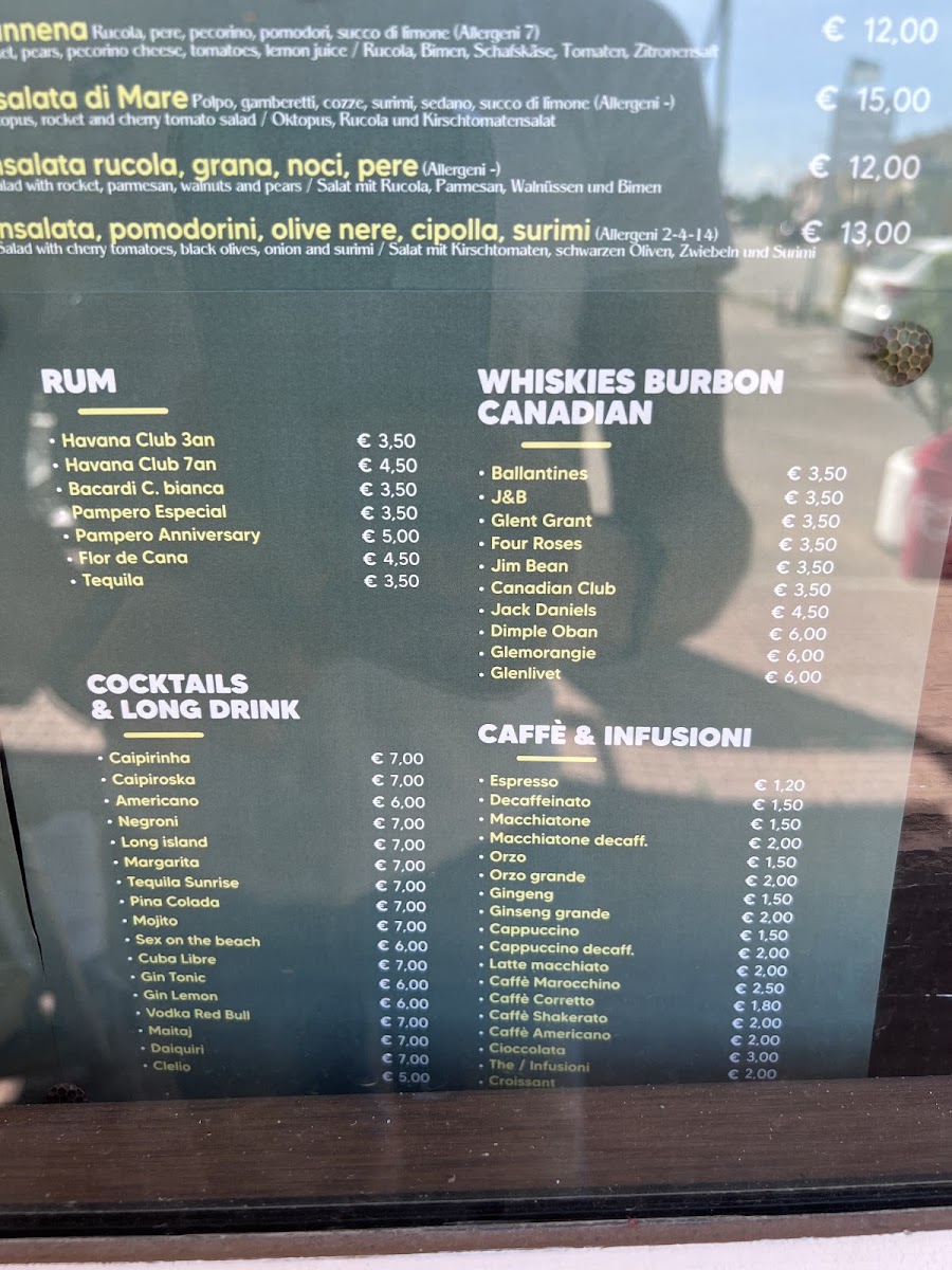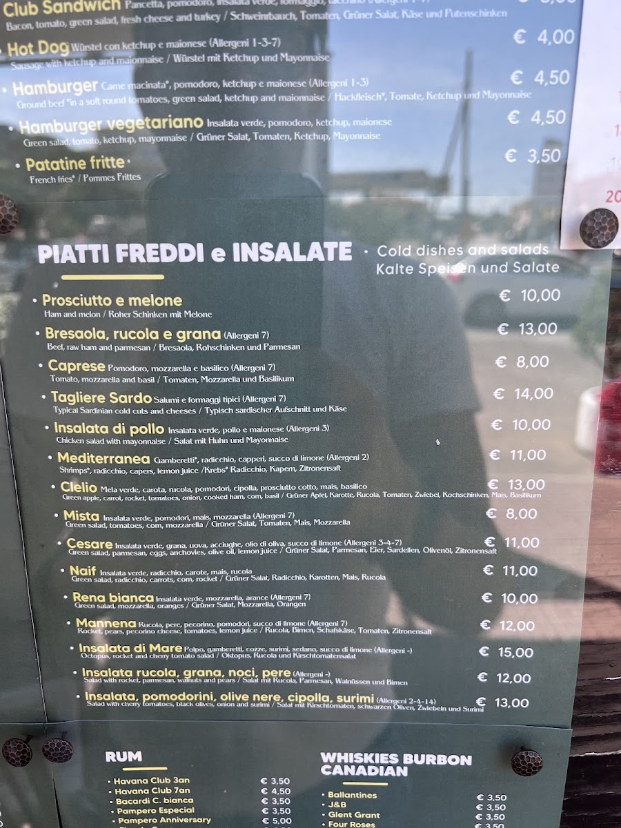 Guests can enjoy freshly poured beers, a variety of pasta dishes like Tagliatelle with prawns and zucchini or Spaghetti alle Vongole, and lighter choices such as mixed salads and panini. The presence of sweet treats like Krapfen paired with frothy coffee makes it easy to linger over a late-morning pause or an afternoon break.